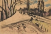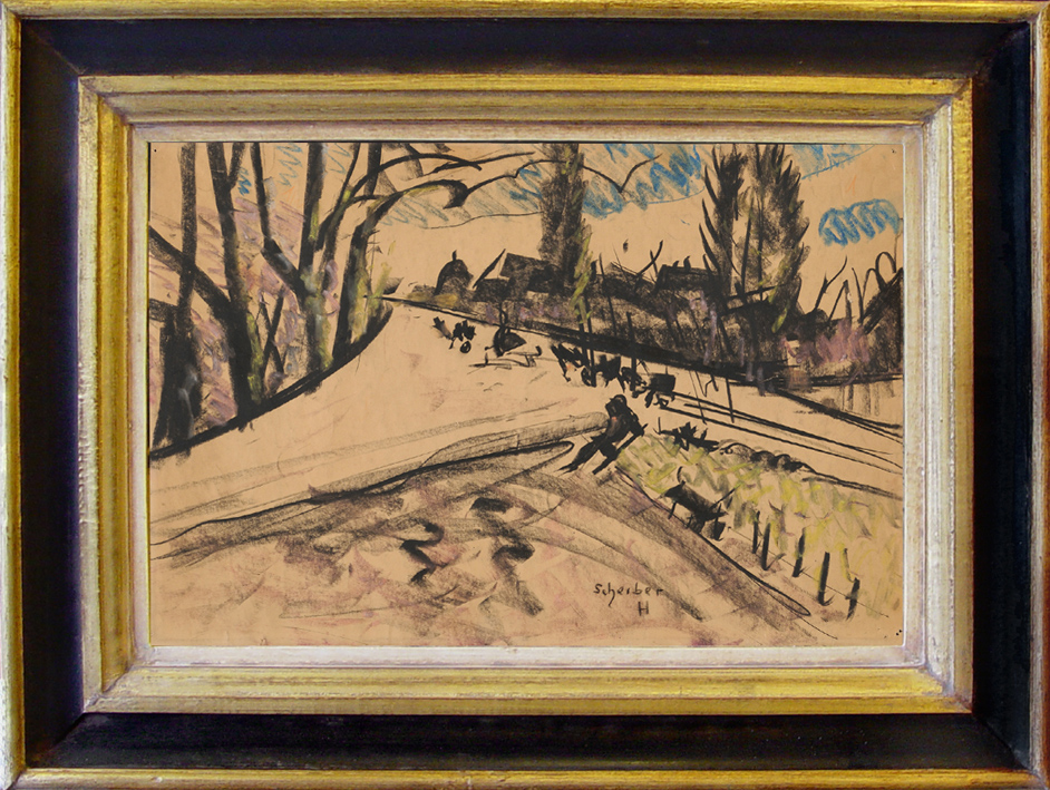 "Park Detail" by Hugo Scheiber, Mixed media on paper, (15 1/2IN. X 22 1/2in.) Excellent condition, handsomely framed. Hugo Scheiber (1873 – 1950) was born in Budapest, Hungary. As a child he moved with his family to Vienna. The family moved back to Budapest in 1890 where he joined the army from 1894 to 1898. From 1898 he studied at the Kunstgewerbeschule in Budapest, attending evening classes, while working during the day to support his family. Finishing his studies in 1900, a post-impressionistic plein air landscape period followed, however from the 1910′s he showed an early interest in Futurism and German Expressionism. He met Filippo Tomasso Marinetti in 1915 and they became personal friends. The latter invited him to join the Futurist movement. He developed a unique modernist style which was closer to German Expressionism than Futurism. He depicted the essence of cosmopolitan life using stylized, expressive colors and forms. In 1919 Hugo Scheiber exhibited in Vienna with Bela Kadar at the Hevesy Salon. As a follow up, he moved to Berlin where his work found strong sympathy with Herwath Walden, the founder of Der Sturm, Germany’s foremost Avant-Garde periodical and a Berlin gallery by the same name. From 1921, Scheiber’s paintings appeared regularly in the journal and exhibitions followed in New York, London, Rome. His friend Marinetti invited him to partake in „Mostra Nazionale d’Arte Futurista“, the momentous Futurist meeting held in Rome 15-30 April, 1933. After his expressionism of the 1920′s, he swayed towards art-deco in the 1930′s.