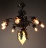 Circa 1905. This is a rare and decorative wrought iron fixture styled on the Queen Anne Period; although it was made in America, this chandelier is stylized in a ‘Fancy French’ almost Rococo manner. Its decorated body is enhanced by the contrasting bare tungsten bulbs it wears, and its uniqueness emphasized by this exceptionally rare (and irreplaceable) ‘Vaseline glass’, bullet shaped shade.
