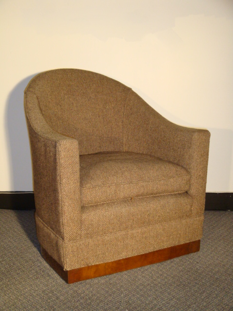 atelier D.I.M.(Joubert et Petit) French Art Deco Club Chair. Barrel back lounge chair on burlwood base. Upholstered in menswear inspired herringbone wool. Loose down seat cushion.