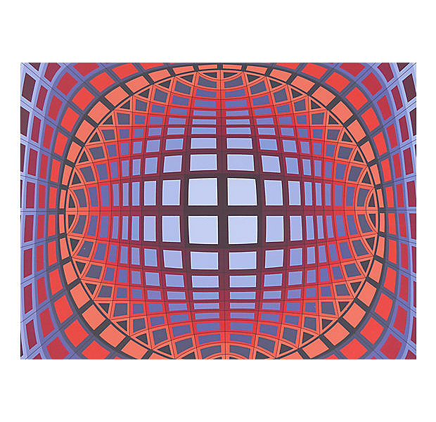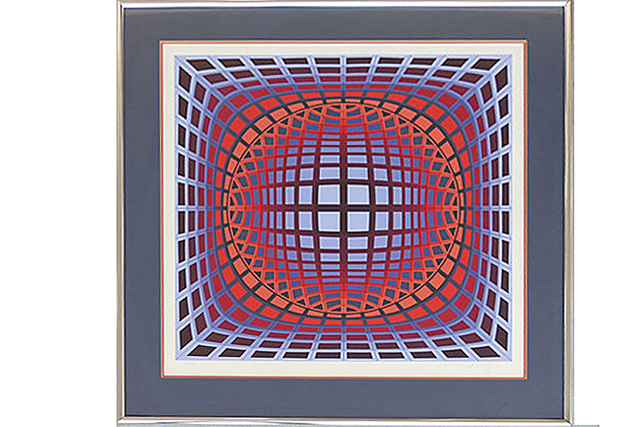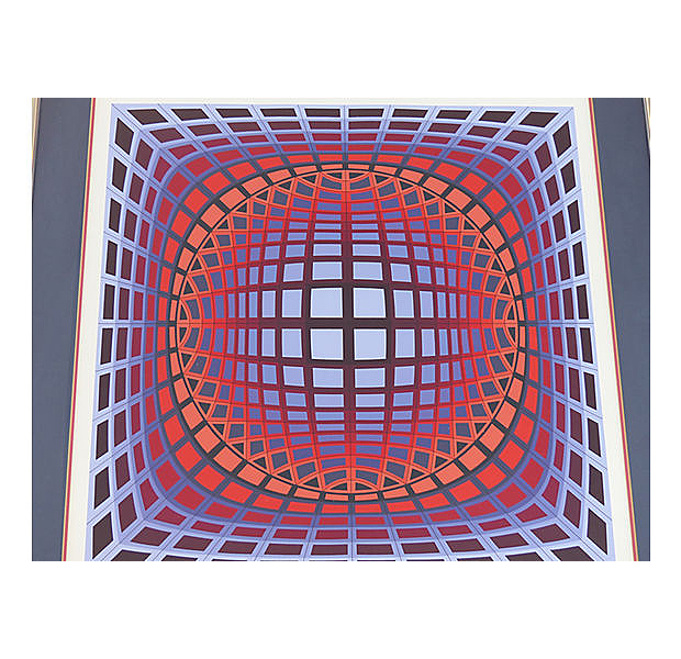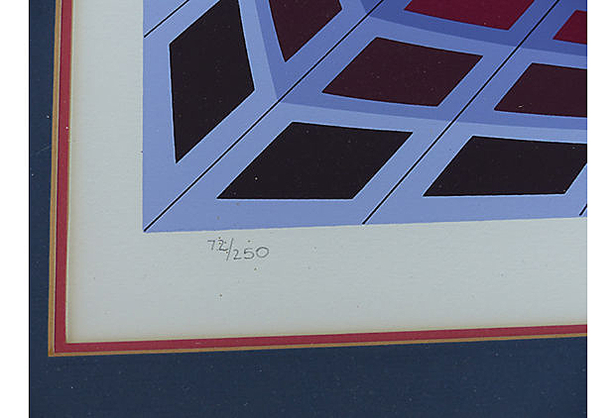 An optical art lithograph by noted Hungarian/French artist Victor Vasarely (1906-1997), considered to be the grandfather of the op art movement. Pencil signed and numbered 72/250. Nicely framed with matte board, chrome plated metal frame and glass. Hungary/France 33" L x 1.25" W x 34" H