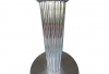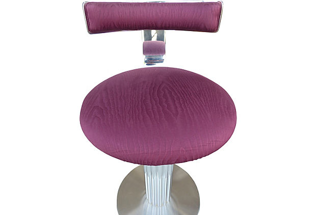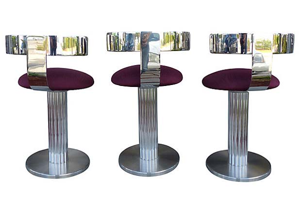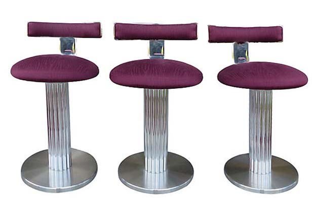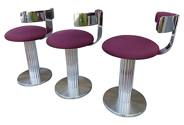 Set of three high-end counter stools with reeded nickel-plated aluminum columns and steel bases by Designs For Leisure. Very heavy and sturdy. Retain original manufacturer's labels. Chrome is bright and shiny. Upholstery is excellent. Seat, 25"H. 18.5" L x 21.5" W x 33" H