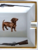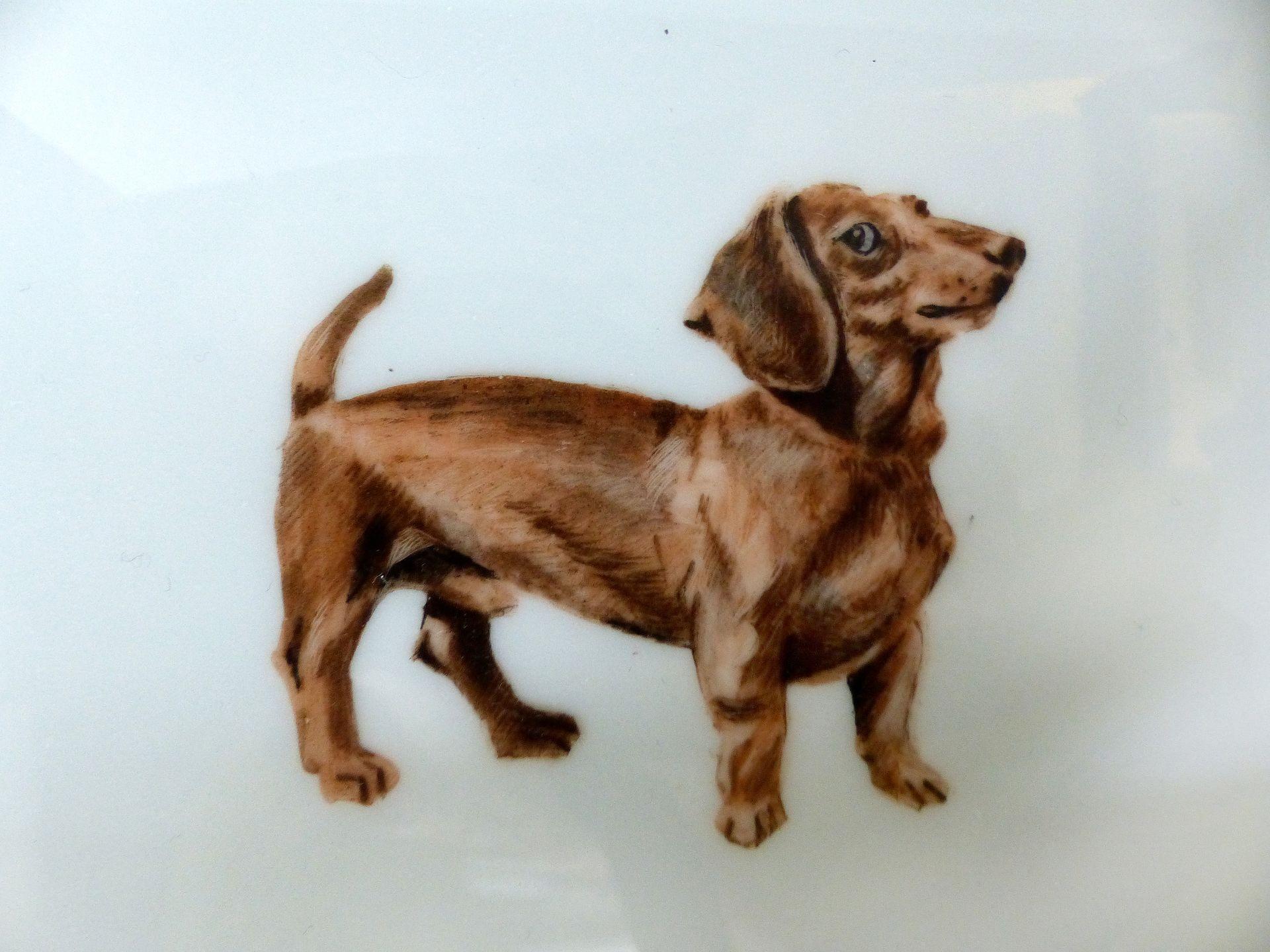 Elegant Hermes French gilt porcelain cigar ashtray decorated with a lively dachshund surrounded by shotgun borders and gilt rims. A wonderful present for the sportsman. Lined with the Hermes suede protective bottom. Marked "Hermes Paris" and "Made in France" on the sides. 7.6ʺW × 6.25ʺD × 1.36ʺH