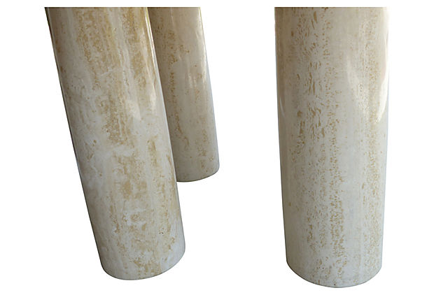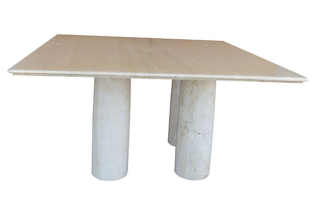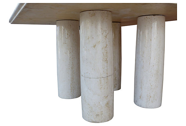 This substantial table design in marble (its name means “colonnade” in Italian) was available in round and square versions – each with a varying number of columnar underside marble supports. While the overarching aesthetic is informed by the massiveness of the designer’s choice of marble, the ultimate form of each table is determined by the consumer’s flexibility in their placement/arrangement of the underside columns. 55.25" L x 55.25" W x 28.5" H
