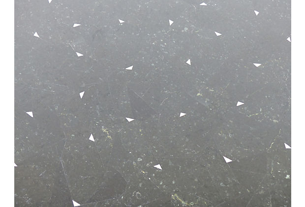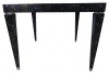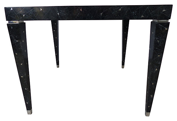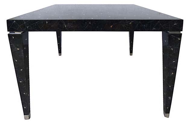 A square table made of tesselated stone with silver metal inlay by Tavola for Oggetti. With tapering square legs and silver metal accents including capped feet. In excellent vintage condition. Original label underneath. 36" L x 36" W x 29.25" H