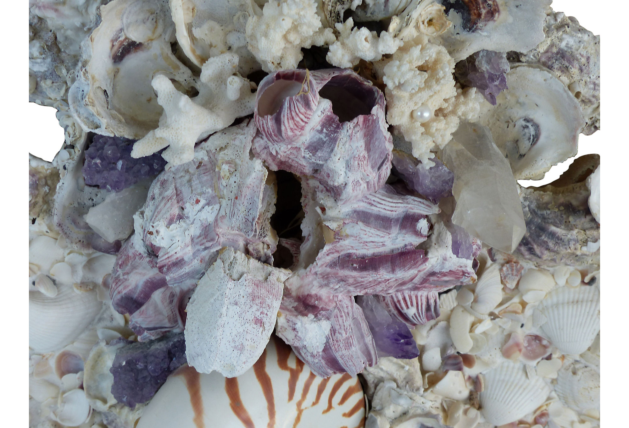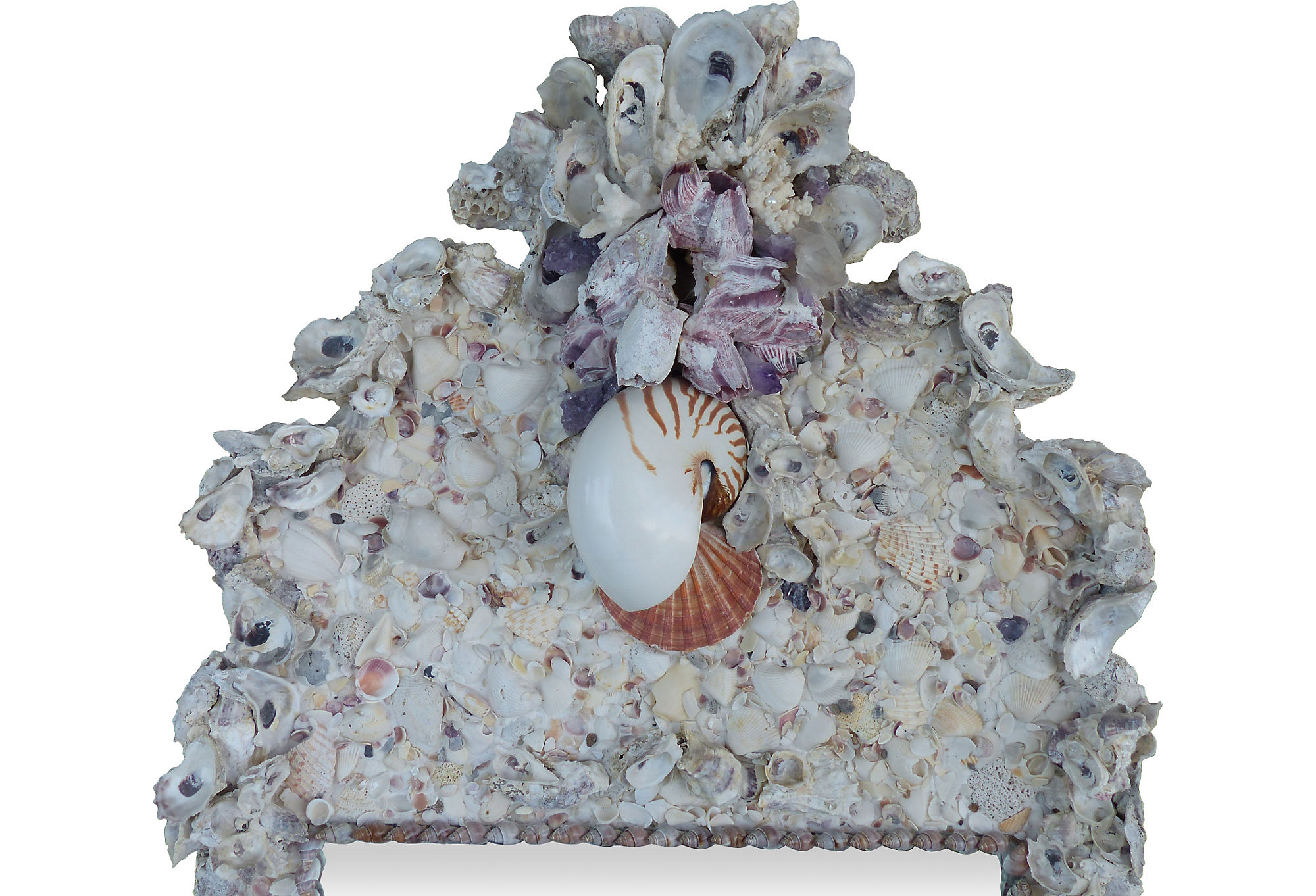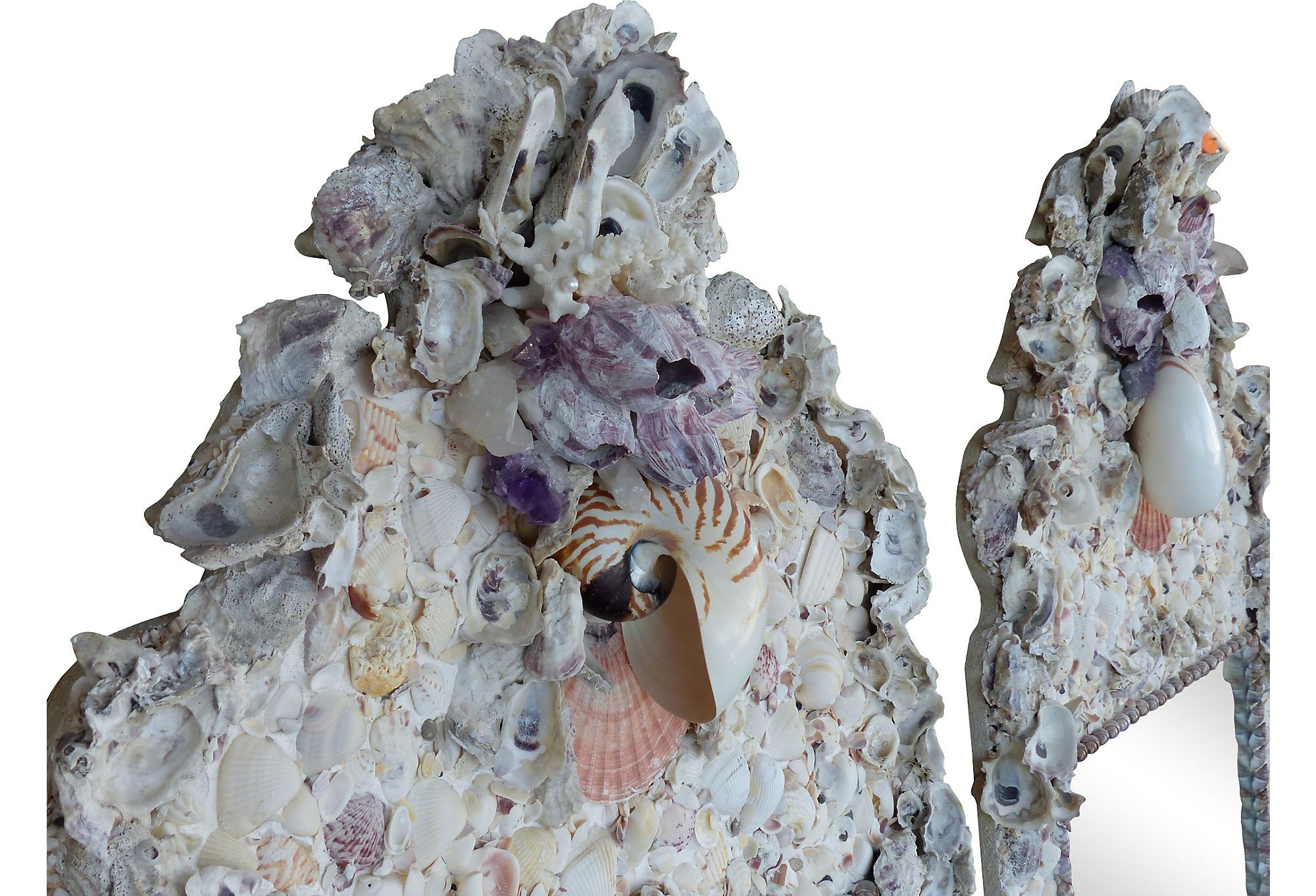 Pair of large handcrafted mirrors covered with shells, coral, South Sea pearls, amethyst, and clear quartz crystal. Unmarked. Ready to hang, hardware included. 27" L x 4" W x 51" H