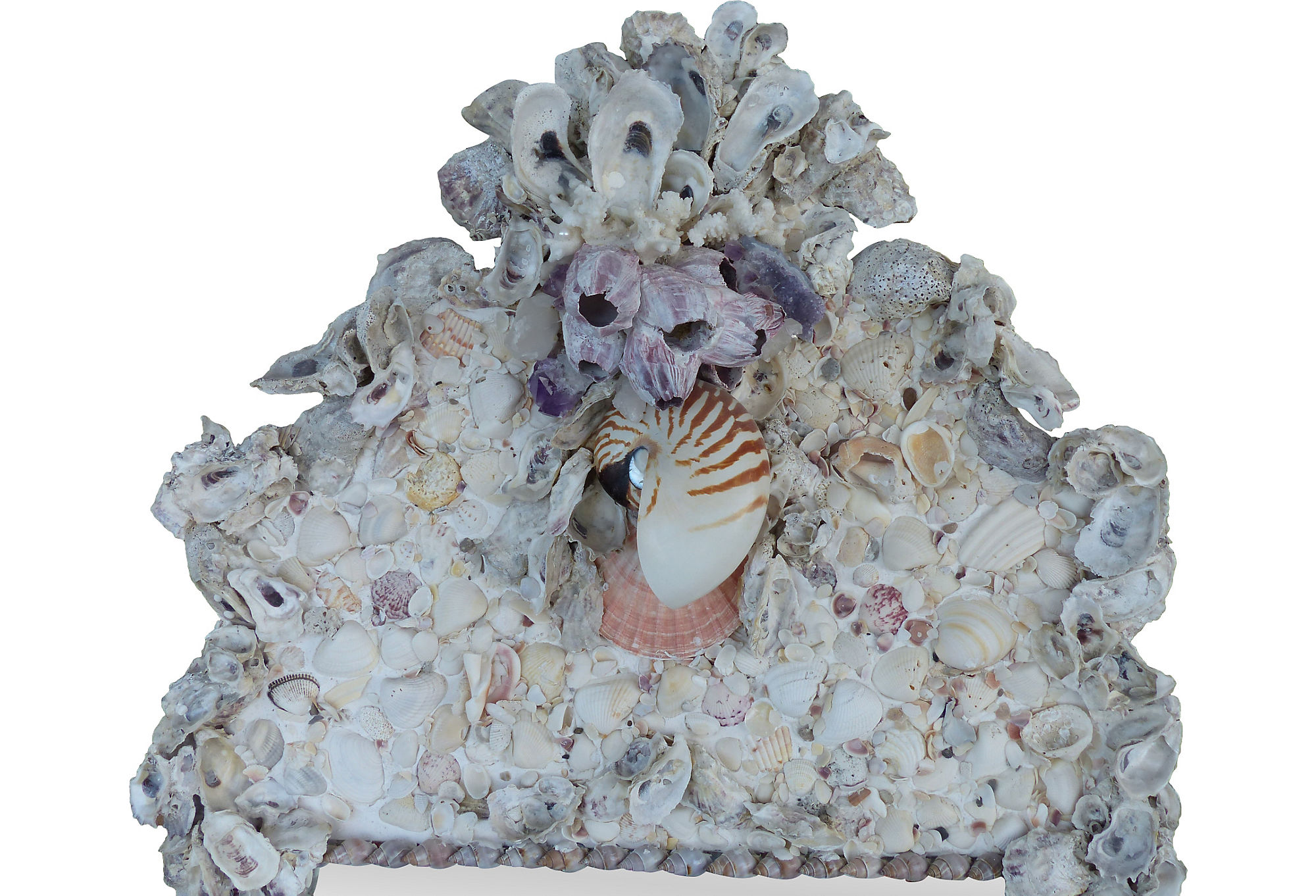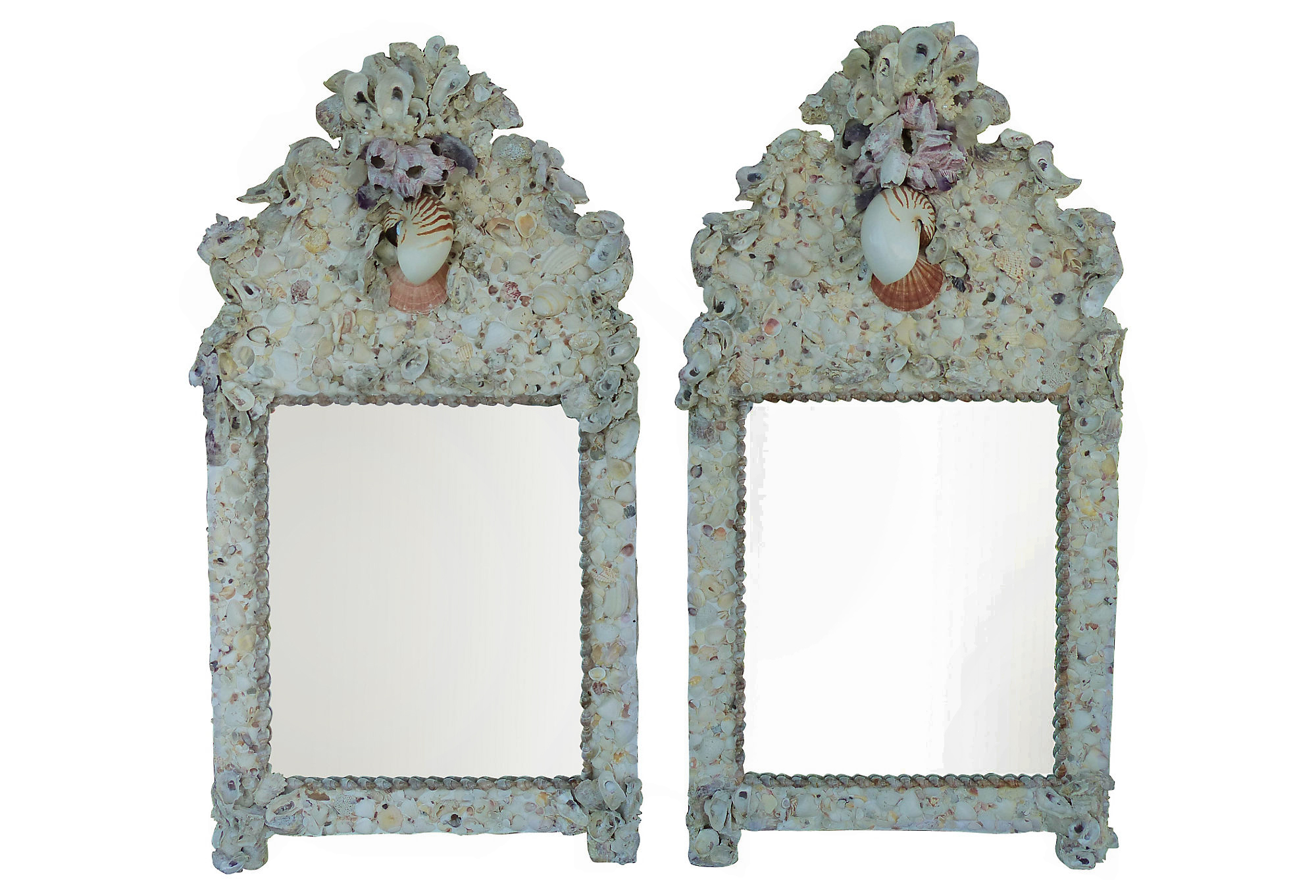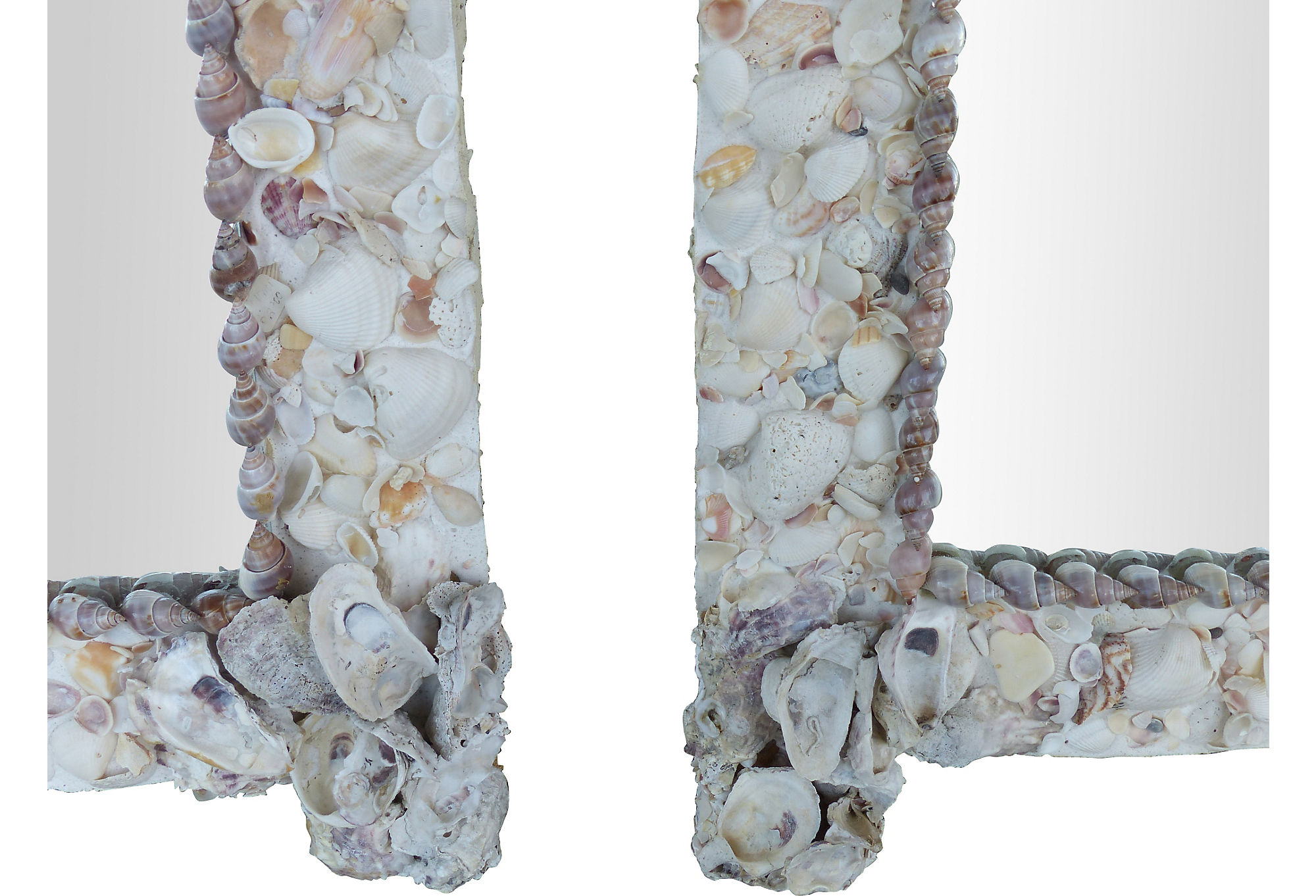 Pair of large handcrafted mirrors covered with shells, coral, South Sea pearls, amethyst, and clear quartz crystal. Unmarked. Ready to hang, hardware included. 27" L x 4" W x 51" H