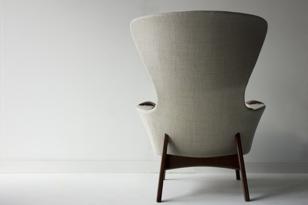 This Adrian Pearsall lounge chair is in excellent restored condition. Reupholstered with original intergrity including hand cut foam and Belgium linen. H: 39(99.06cm) W:32(81.28cm) D:33(83.82cm) Seat Height: 19.5(49.53cm) Seat Width:21.5(54.61cm) Seat Depth: 20 (50.8cm) Arm Height: 20.5 (52.07cm) Pricing to trade: Yes **Please contact for shipping cost; for International shipping quotes, please leave your address and phone number**