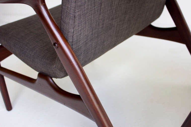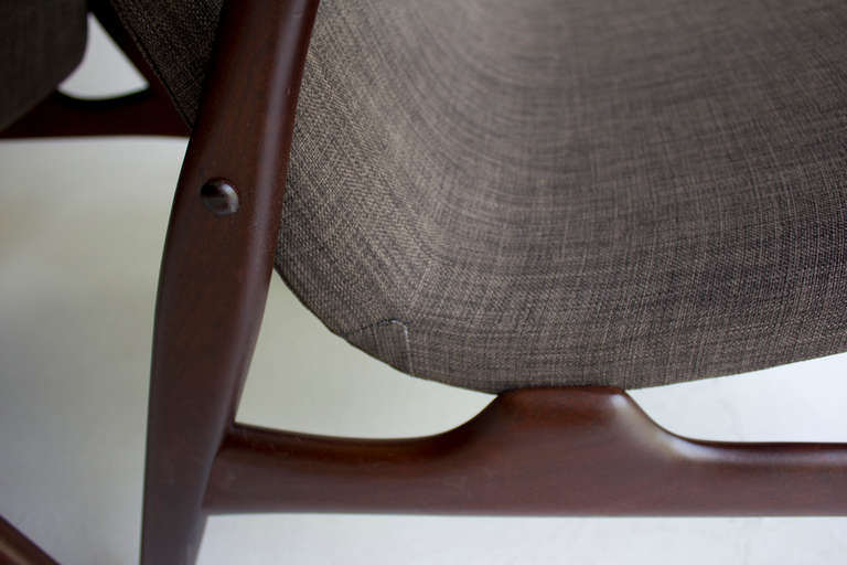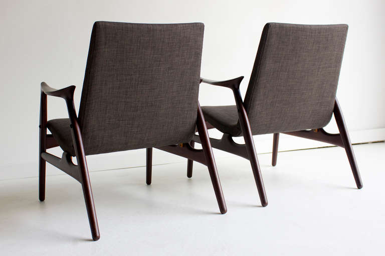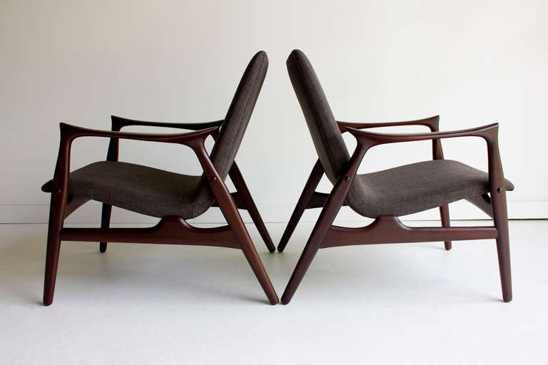 These Arne Hovmand Olsen Lounge Chairs for Mogens Kold are in excellent restored condition. Reupholstered with original intergrity including hand cut foam and high durable fabric. Arm Height: 22.5 (57.2cm) Seat Height: 15 (38.1cm) Seat Width: 20.75 (52.7cm)