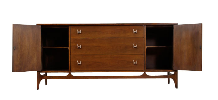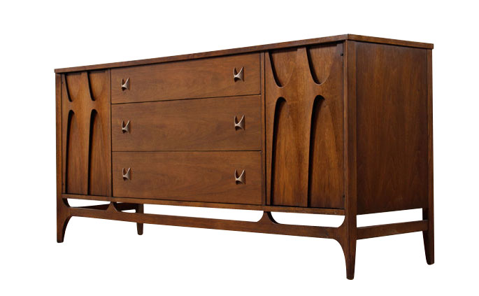 Restored mid century modern Broyhill Brasilia credenza. Vintage 1960s designed by famed architect Oscar Niemeyer. The cabinet's signature arches and pulls are modeled after buildings designed by Niemeyer for Brazil's capital city. Dark chocolate colored patina tot he the half-a-century old walnut wood. Top surface has been professionally refinished. All drawer pulls have been hand polished to reveal a brilliant copper tone. One of the most beloved and collected lines of American furniture the the atomic age. It is easy to see why so many fall in love with Brasilia. Restored with hand polished pulls and professionally refinished top surface. Original cabinet is clean with no notable wear.