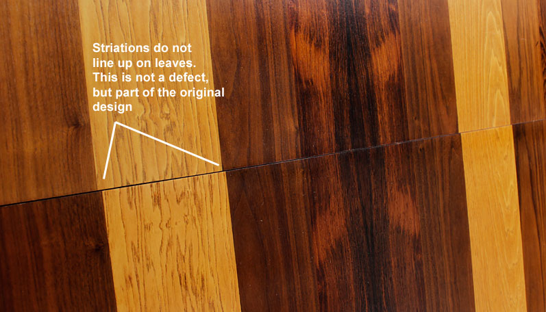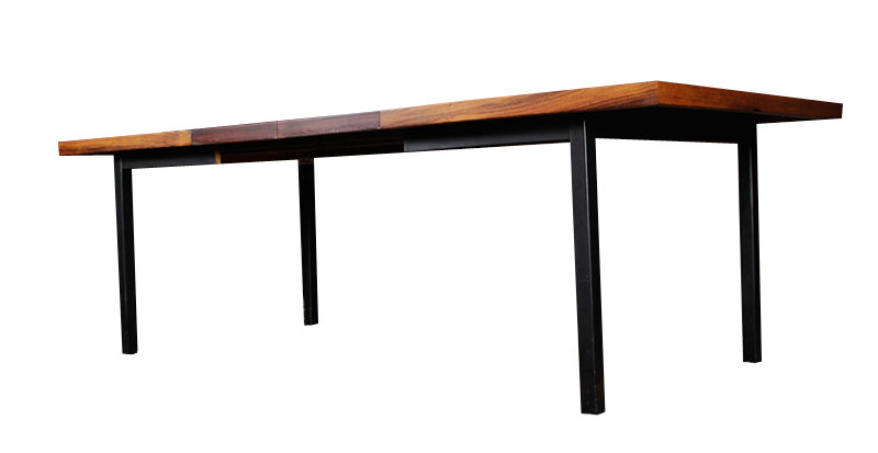 abulous mid century modern dining table by Milo Baughman for Dillingham. The striated designed is created by layers of rosewood, walnut and hickory veneers. The striking array of wood tones is contrasted by black enamel legs (original). Table comes with two 18" leaf extensions. Previous owner had the table refinished.