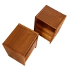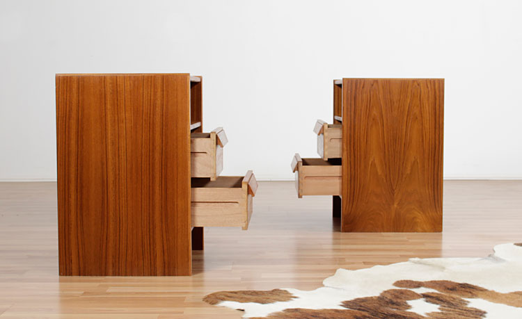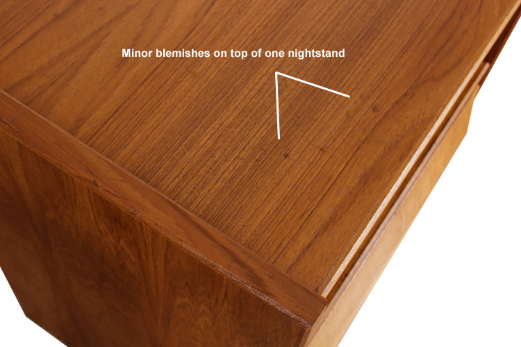 Pair of mid century modern Danish teak nightstands. Ample storage with two spacious, dovetailed drawers in each nightstand. Open shelf at top is ideal for reading material and tablets. Carved solid teak wood handles on the drawers facades. Stamped with the maker's mark. Produced by Svend Skipper's "Skipper Mobler."