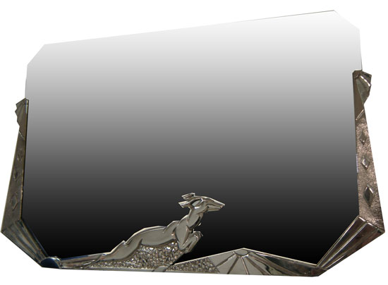 This French art deco nickel bronze mirror was created by L. Charles in his atelier at 8 Cours Lafayette, Lyon, France in the 1920’s. The leaping deer, a favored icon of the deco movement in France, rises into the mirror glass. Charles uses texture to depict the ground below the deer and to contrast the sunburst motif and the stylized drapes in the vertical portion of the frame. Re-nickel plated and with a new glass, the mirror, which measures 19” high x 31” wide, is ready for another 80 plus years of good reflections.