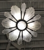French Art Deco starburst chandelier by G leleu. Having 12 outer clear frosted molded glass panels and beautiful centre bowl having geometric motif. Polished details on a silvered nickel bronze frame with a geometric design. Has been rewired for American use with seven candelabra sockets.