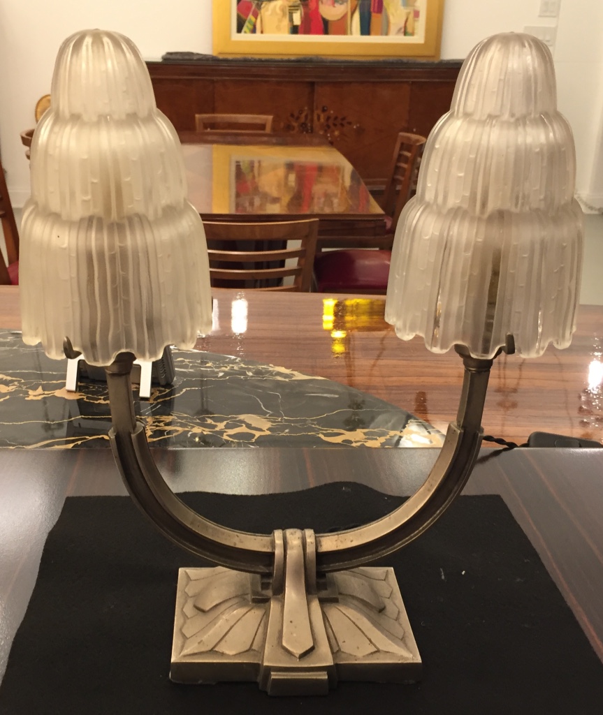 MARIUS-ERNEST SABINO A PAIR OF TWO-BRANCH SILVERED BRONZE TABLE LAMPS the bases modelled, with frosted glass shades, the shades with moulded mark Sabino 4640 Re-plated upon request