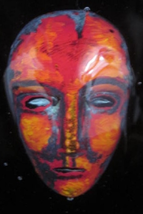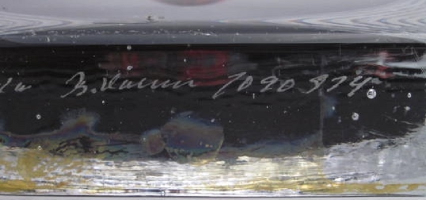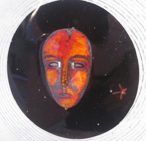 This is a Bertil Vallien art glass sculpture from the Kosta Boda Gallery in Sweden. Bertil Vallien is a renowned Swedish artist specializing in ceramics and art glass. The sculpture depicts a thick, clear glass tile with a central, multi-colored face surrounded by a solid black circular border. The border is then surrounded by molded glass rings within the back of the tile, creating a wonderful sense of motion. The multi-colored face features painterly splashes of red and orange accented by cool blue hues. The face is also positioned slightly towards the front of the tile as the forehead and nose create a subtle mound on the surface of the glass. An "Artists Choice From Kosta Boda" sticker is placed along the front, top edge of the tile while the gallery's sticker is placed along the front, bottom edge. The underside of the tile is etched with "Kosta Boda," "B. Vallien." and what looks to be "7090974." The piece is in excellent condition with some accretion or sticker residue along the bottom edge, as shown in the photographs that include the signature. There are no chips, scuffs, or cracks of any kind. It measures approximately 7.75" from top to bottom edge, 7.75" wide, and 1" thick.