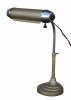 This Art Deco Streamline Modern lamp is finished in a light bronze metallic finish with chrome accents. The lamp also possesses chromium and enamel adjustable bankers.