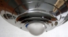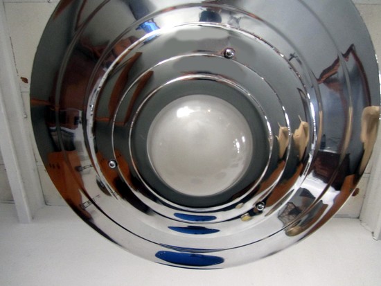 This American art deco ceiling lamp resembles a flying saucer was made in the 1930’s by the Miller Company of Meriden, Connecticut. The ceiling light consists of two graduated size aluminum shades separated so that light can emit from the space in between each shade. An aluminum shaft supports the shades from an aluminum ceiling cap and a milk glass globe centers the lower shades.The light descends 30” from the ceiling (it can be shortened to customers’ requirements) and the larger shade is 20 ½” in diameter. The aluminum has been polished and the fixture is rewired.