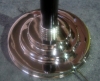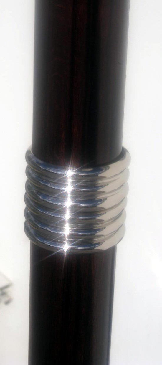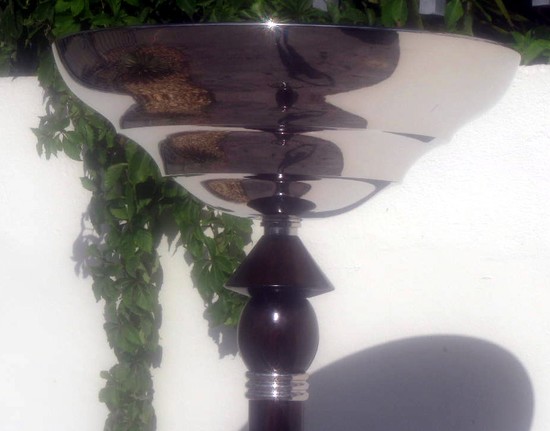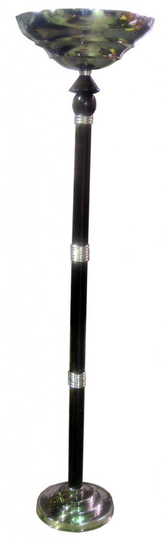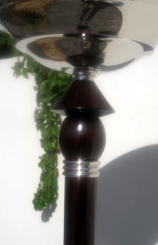 This rare pair of majestic French art deco floor lamps is a creation of the famed Atelier Petitot in Lyon, France. A similar lamp appears in their 1937 catalog. The torchieres have weighted three step nickel bases with three faux painted Macassar ebony shafts separated by bright nickel “speed” rings. The upper wood portion incorporates a ball and dome motif and is surmounted by a unique stepped bright nickel bowl. The lamps are 70” tall and the bowls are 18” in diameter at the top rim. The metal has been replated and coated with clear lacquer and the lamps have been rewired for American electricity.