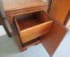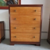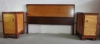 Donald Deskey (1894-1989) designed this bedroom set in 1931 for AMODEC (American Modern Decoration), a company he founded. The line was produced for him by the Thomasville Chair Company and the Finch Furniture Company, both of Thomasville, North Carolina. Constructed of natural finished figured primavera veneers and mahogany stained maple trim. The set consists of a headboard, two nightstands and a four drawer chest. The chest , which measures 35 ½” wide, 18 ¼” deep and 45 ½” high is stenciled on the back “AMODEC line 13, No 927-10 chest”, a metal “AMODEC” tag is in the top drawer of the chest. The two nightstands are 14 ½” wide, 18” deep and 27 ¼” high, one stand has a metal “AMODEC” tag. The headboard is stenciled on the back “AMODEC line 13, No 927-6 bed and is 57” wide and 36” high.