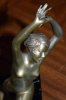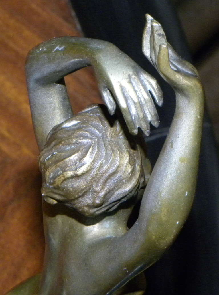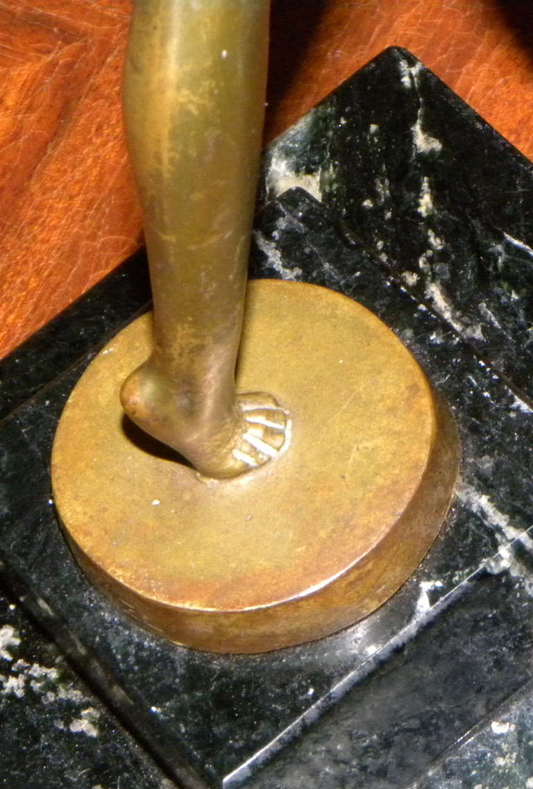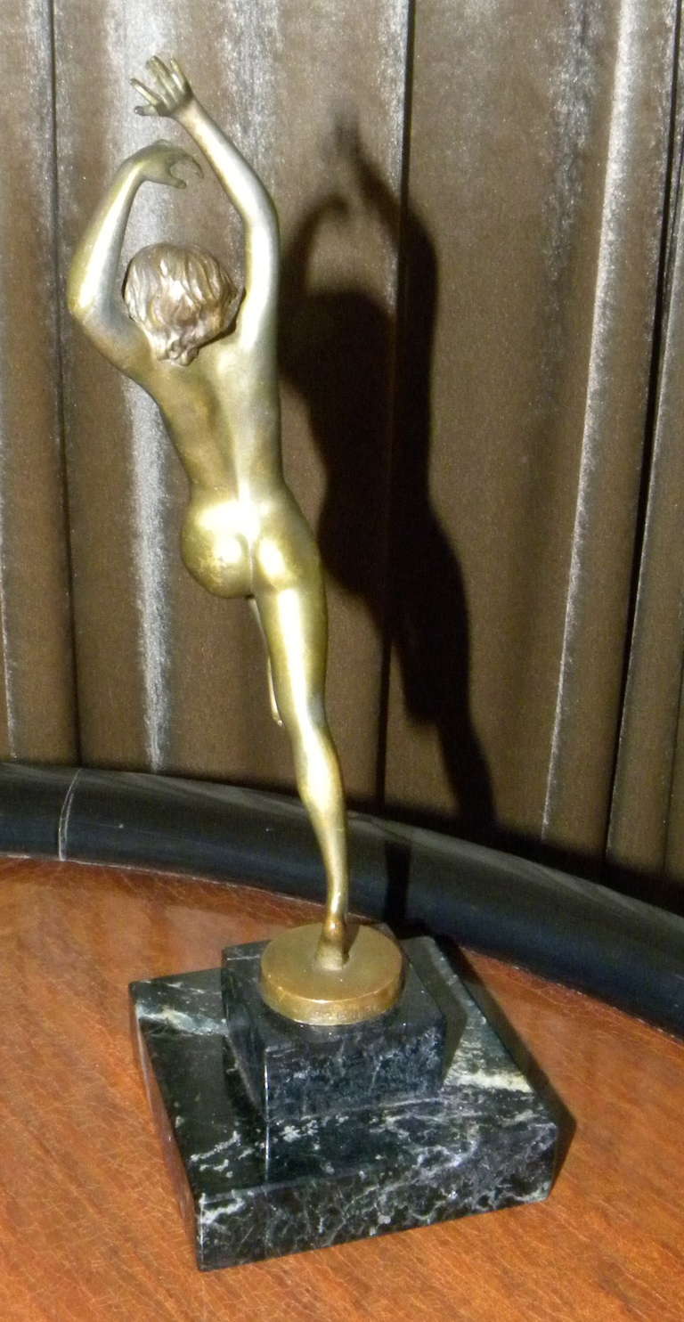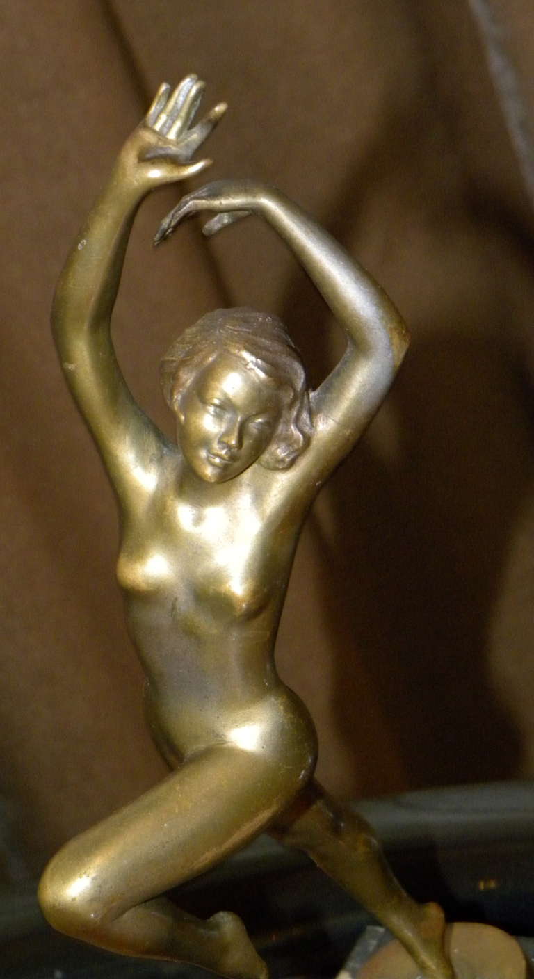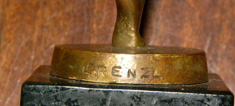 Josef or Joseph Lorenzl is one of the most collected, popular and prolific sculptors known during the Art Deco period. His work is very high quality and synonymous with the style we attribute to and so specifically call Art Deco. This piece particularly has quite a unique posture, showing the nude ballet dancer in motion. This is a wonderful example of the artist's work, it is bronze, the style is fluid, the finger, hands and feet have incredible detail, as does the hair and her lovely face. The is a very graceful Art Deco lady and certainly would look stunning in your proper place. Maybe best known for the scarf dancer, but he has executed many stylized bronzes, represented in just about every book on Art Deco. He also is well known for his work in ceramic for the Goldscheider company. This piece was recently released from a personal collection kept for over 25 years. Measurements: 12" T x 4" W x 4" D