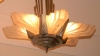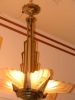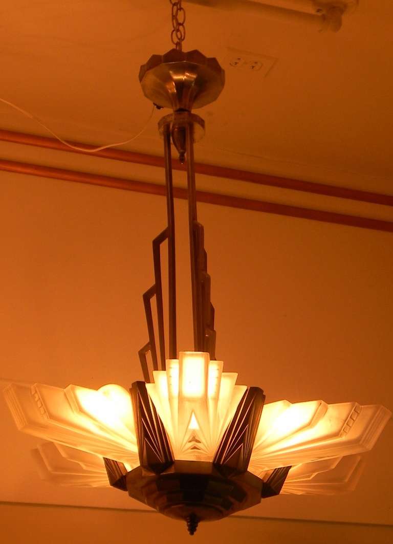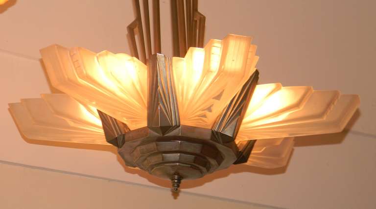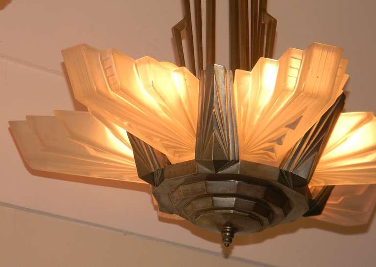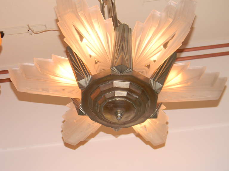 We are pleased to offer this outstanding French Art Deco fixture. Just fresh out of an Estate in Southern France. Completely original signed glass and also signed on the metal (A.P.) as well. This is one of those rare examples of a true Art Deco design. One can see a truthful relationship between the design of the glass and the design of the metalwork. Circa 1935, this high quality nickel plated sold bronze metal work by the famous company of H. Petitot. Also refered to as Atelier Petitot. I have not had the opportunity to present such a glorious and complete fixture in some time. If you have the right location, this is a fixture that will really amaze you and add that special Art Deco glamour that only truly wonderful chandelier can do. The repeated starburst design with geometric motifs in the glass on the metal face you from every angle. For me, it kind of like a Busby Berkeley flower dance. It is in amazing original condition, we have only re-wired it, but everything else 100% original. This is a chance to own quite a remarkable piece of Art Deco design. Measurements: 33" Drop x 26" W