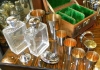 Made by the famous German company for all the great fitted cocktail designs of the 1930's. You've heard of the Zeppelin, the Airplane and numerous other configurations, maybe the most detailed and fitted cocktail paraphernalia of the period. Here is a set I've never seen in 25 years and yet it has all the markings, signatures and point of view attributed to the "made in Germany" to J.A. Henckels maker. This one not only has the electroplated silver finish with shaker, cups, nut dish, etc, but also has two glass flasks, all fitted together in a leather carrying case. Quite the traveling bar, great for the advance cocktail shaker collector, or those of you ready to add a little panache to the latest Gatsby picnic setting. I guess if you have to ruff it, this is a nice way to do it! LOL