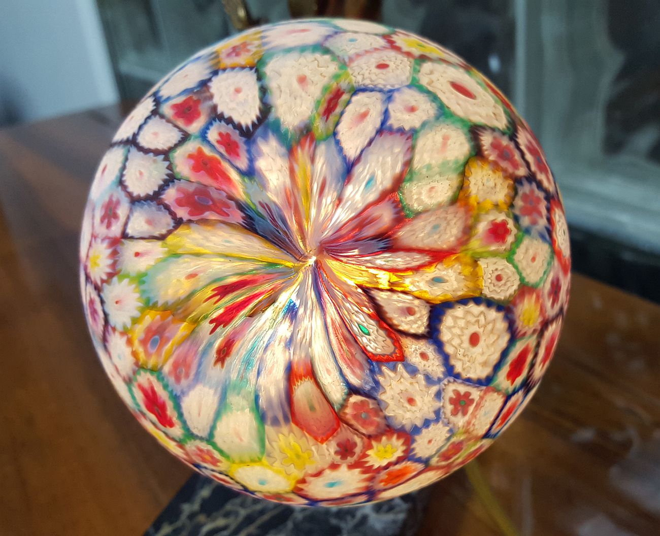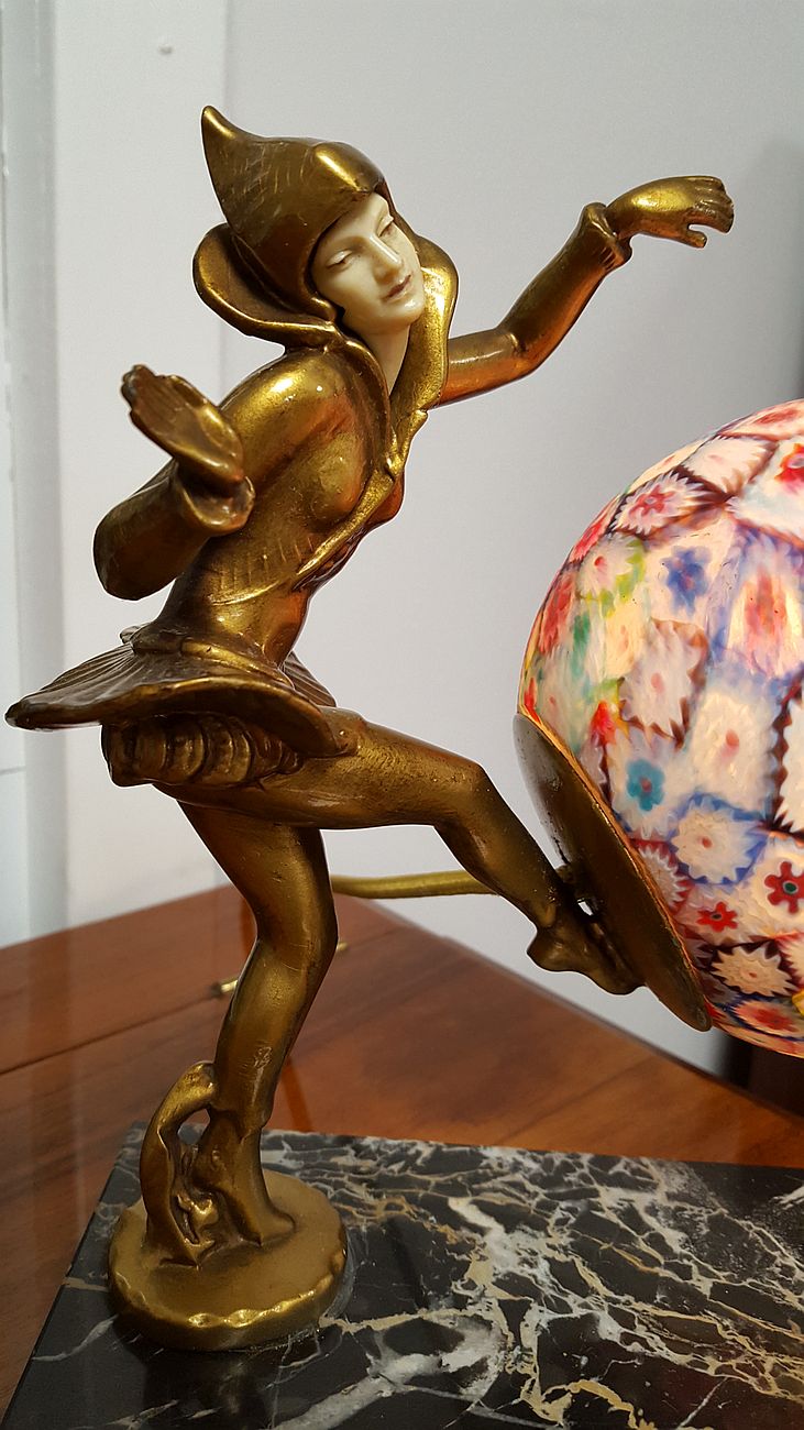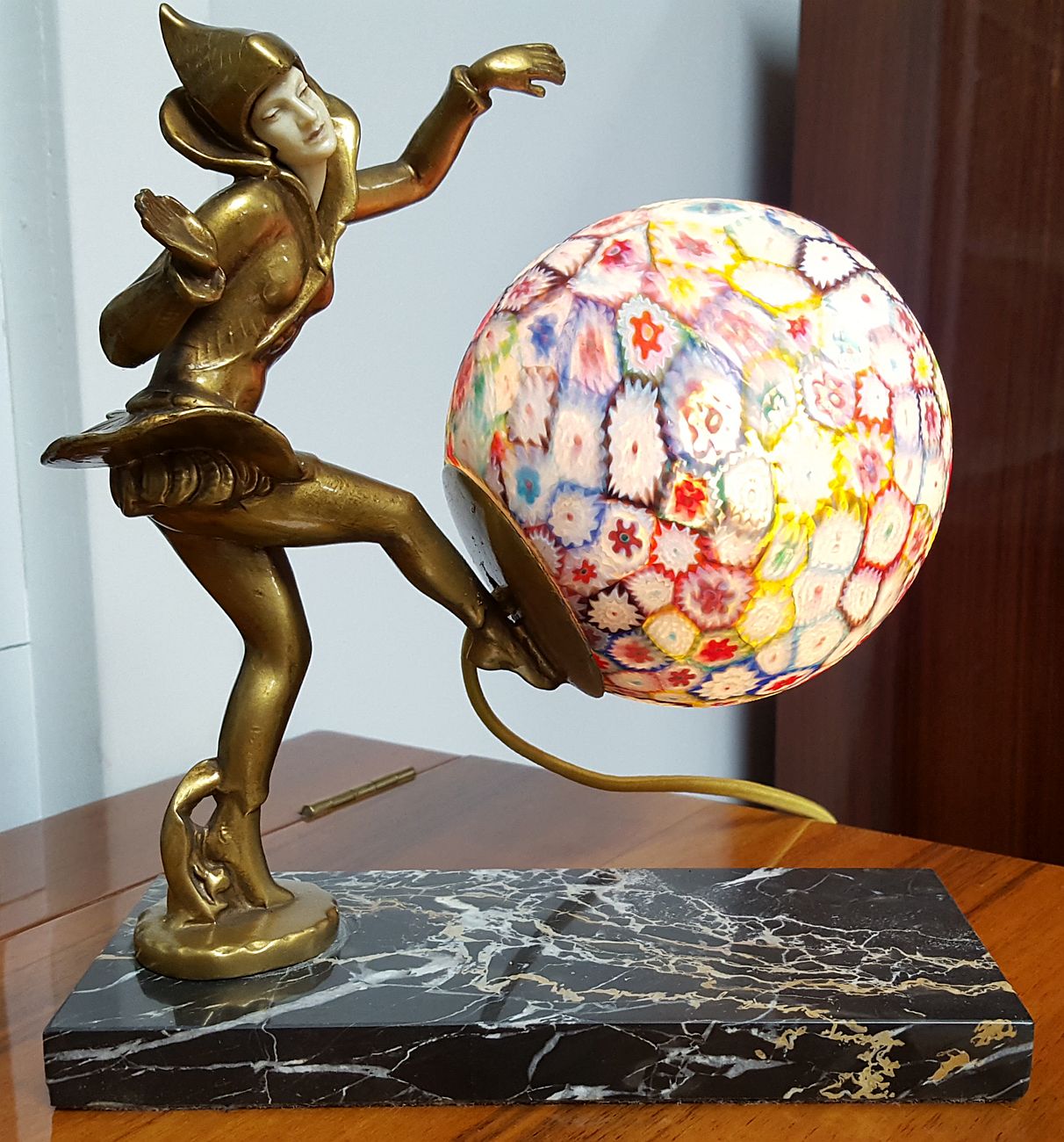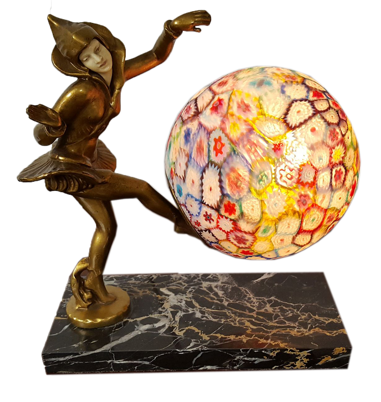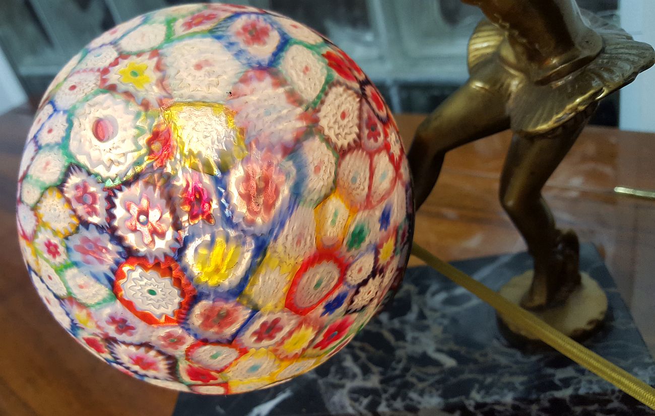 The lamp is depicting a costumed figural female with an Italian Murano Millefiori glass ball globe, raised on an Italian Portoro marble base.