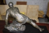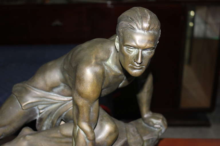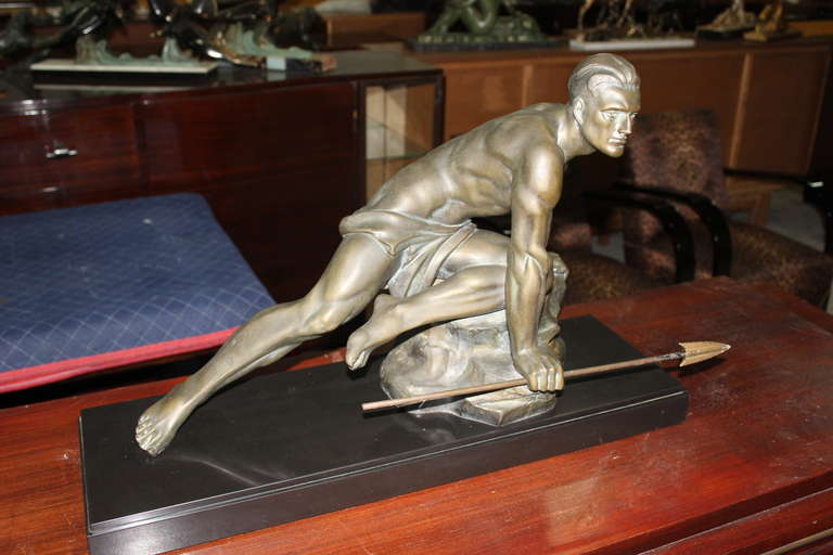 A French Art Deco Patinated Metal Sculpture of a Hunter by Famed Artist Jean de Roncourt. The sculpture is 27" long and 17" high.