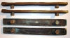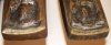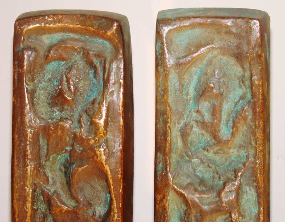 2 pairs of Mid Century Modern cast bronze door pulls from the elite hardware manufacturer Forms and Surfaces. These pulls are perfect for double entry doors. These are over-sized, extremely heavy and of superior quality. The bronze patinas are rich with the interior doors pulls being darker and the exterior pulls having achieved a verdigris patina in the deeper levels of the designs. The pulls are designed in slightly irregular rectangular forms.