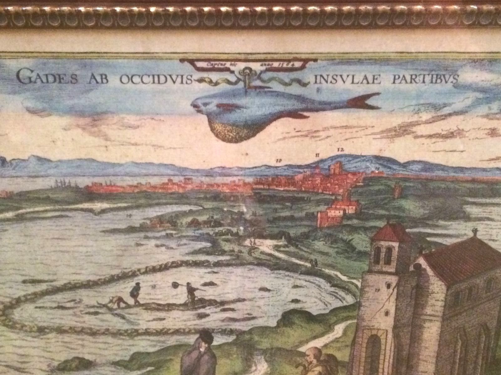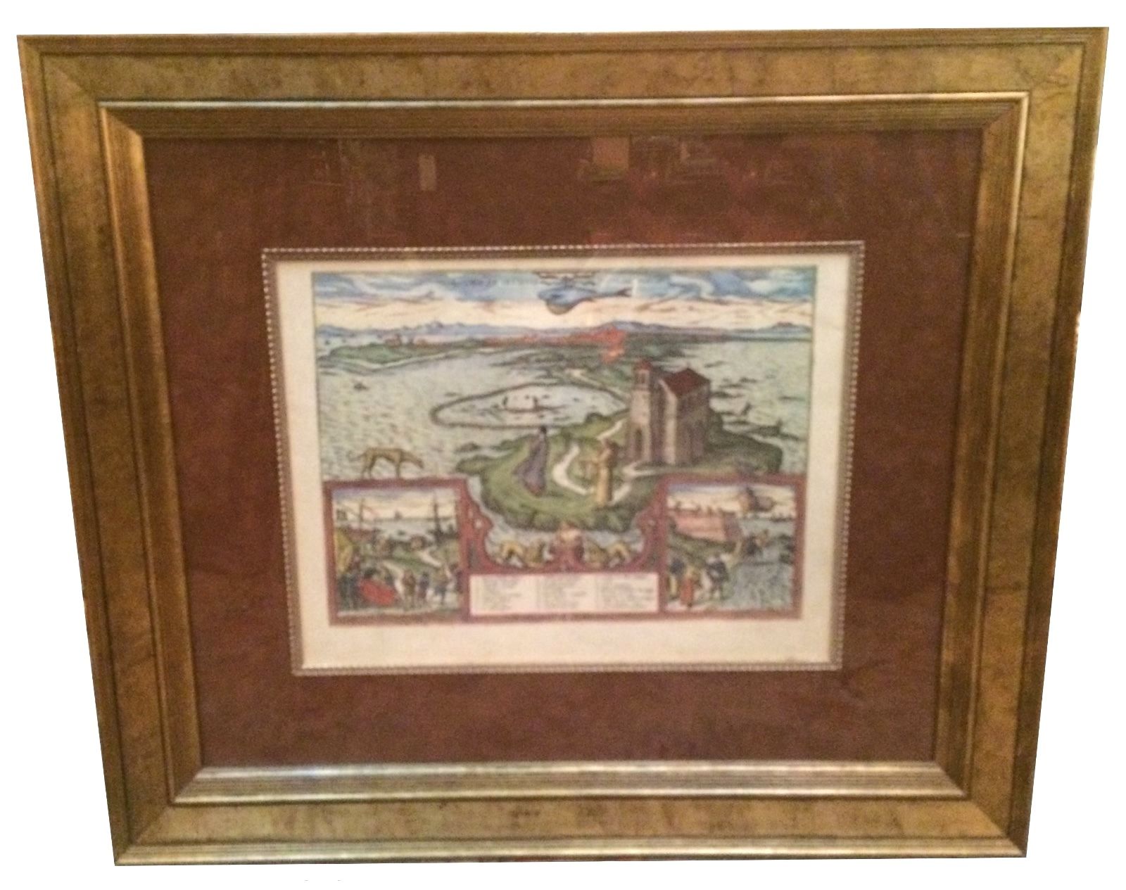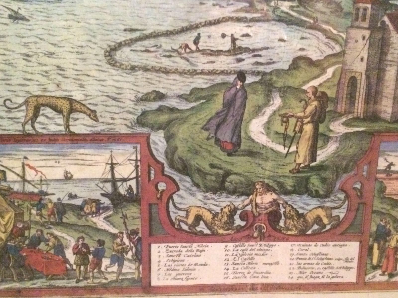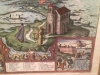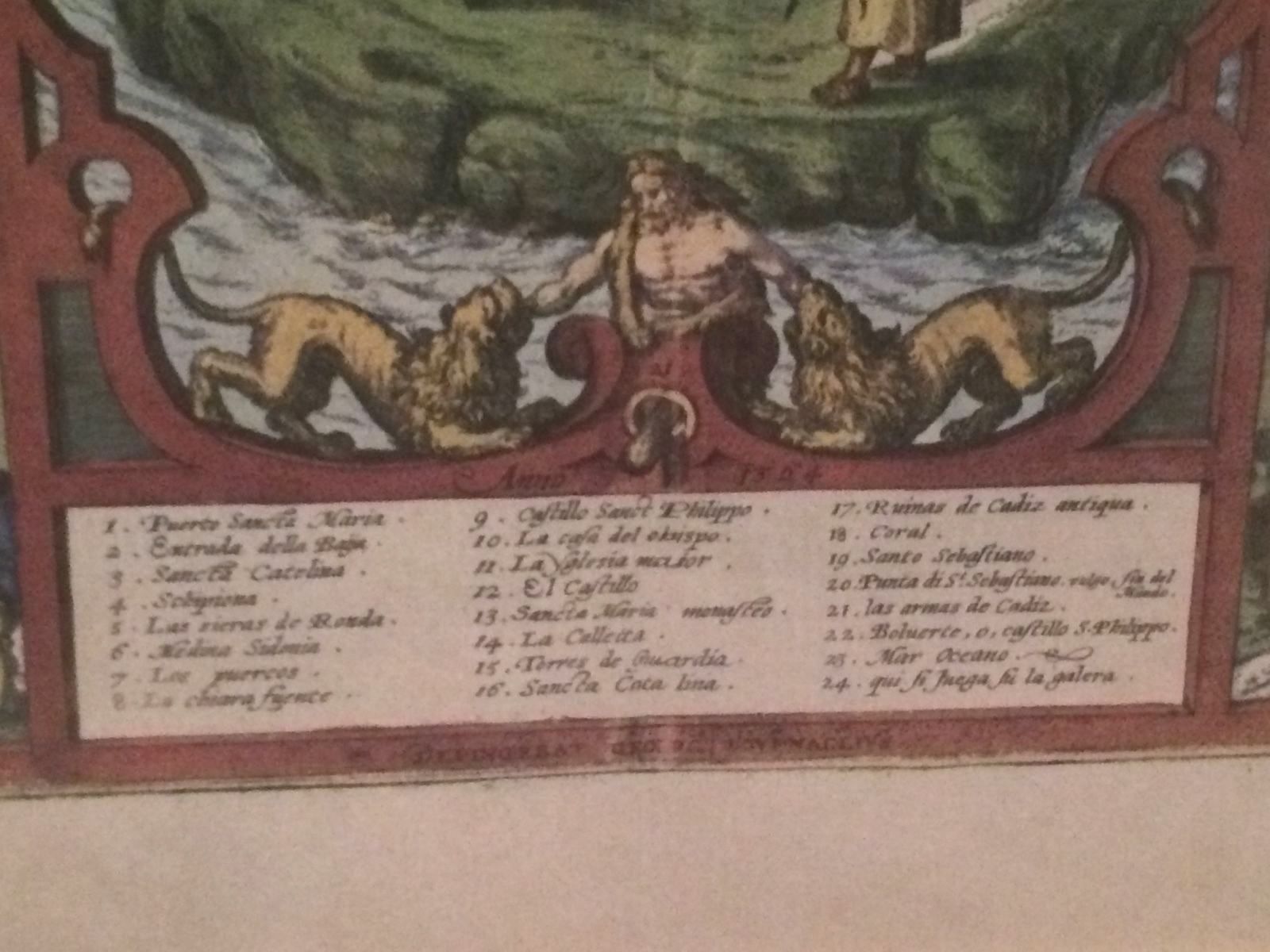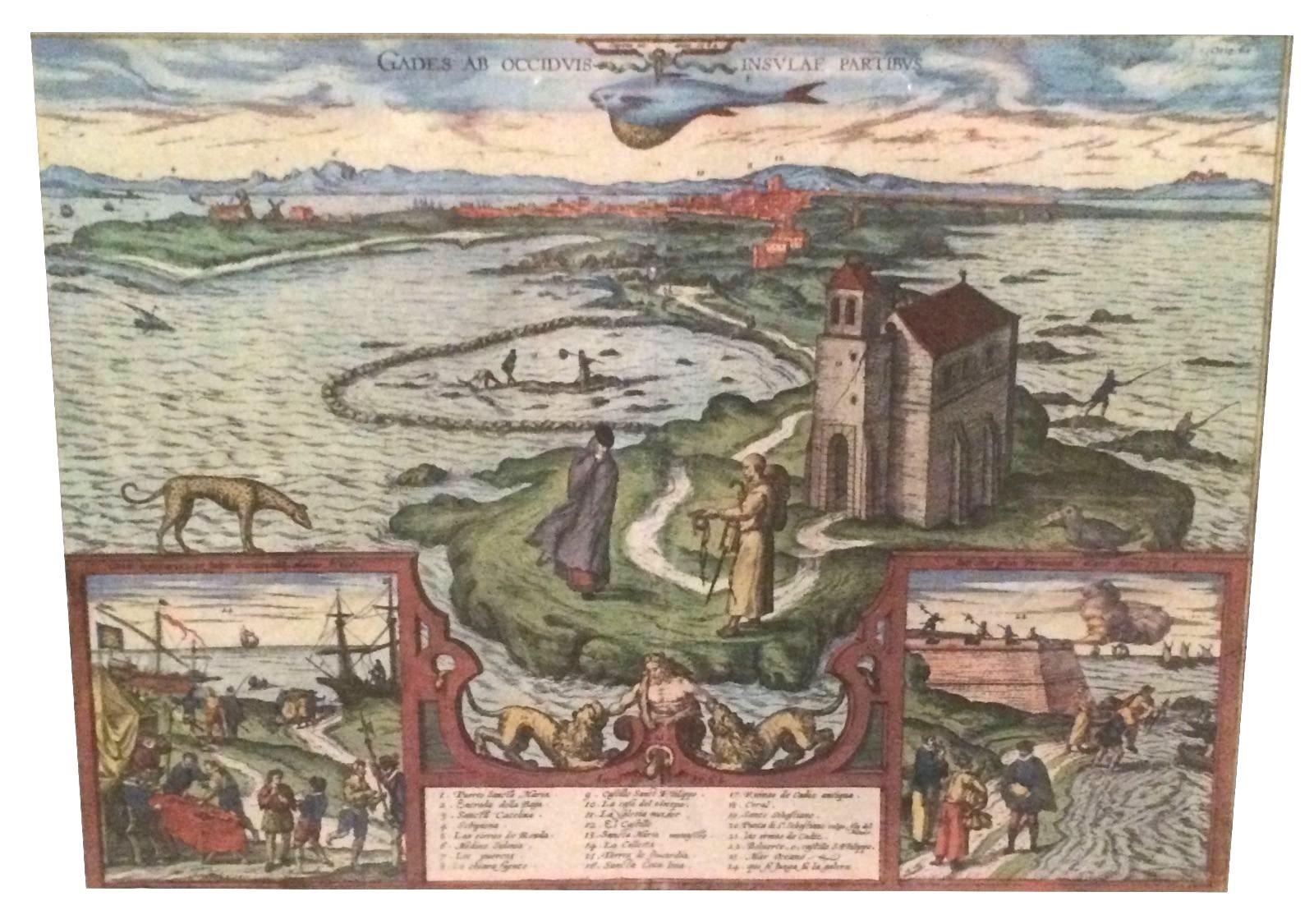 This hand-colored map "Gades AB Occidvis Insvlae Partibvs" of Cadiz, Spain by Braun and Hogenberg is in excellent condition. Its an aerial view of renaissance Europe (1300-1600) . It features figures in the foreground, map legend, two vignettes. Map measure 16x20in (measurements do not include the frame)