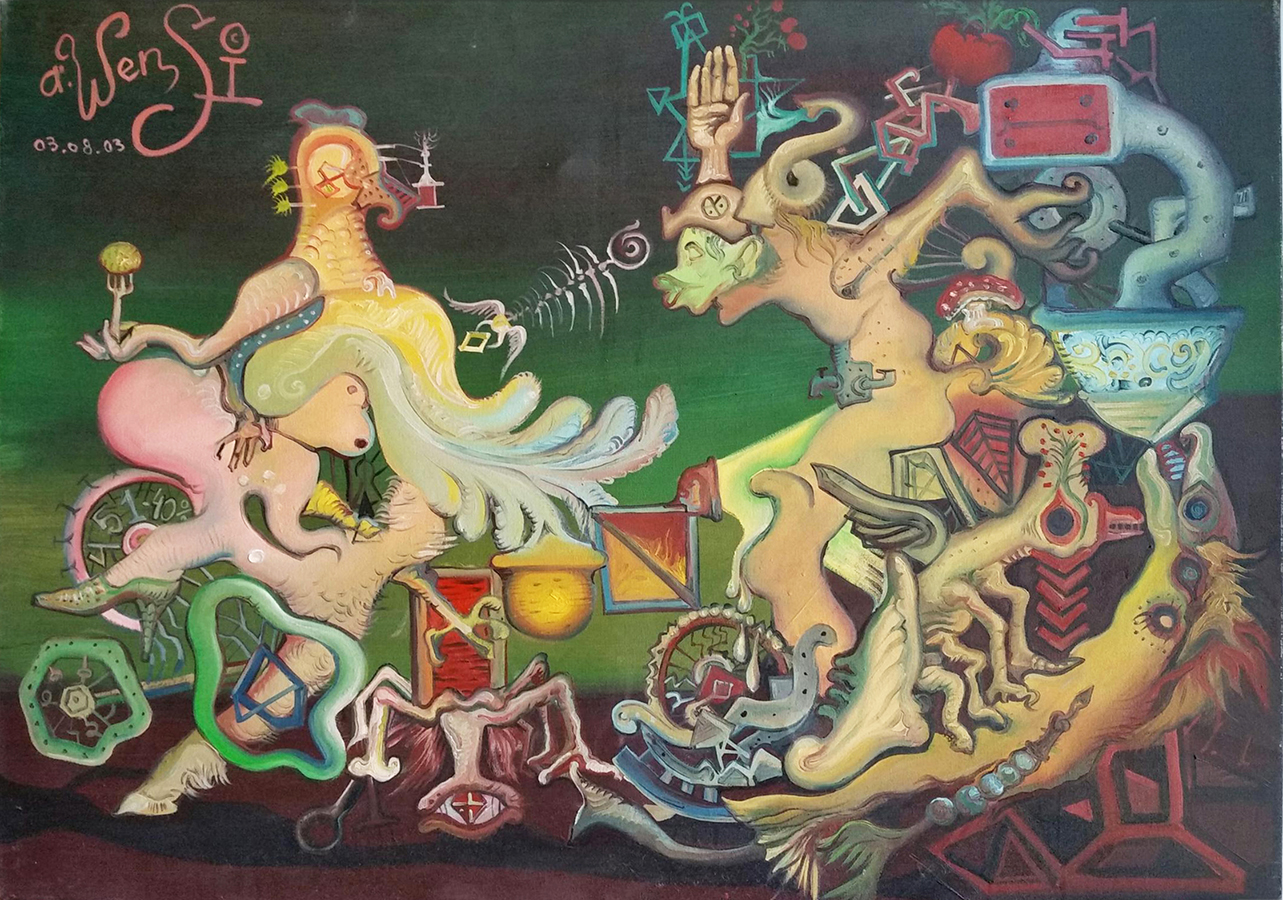 Surrealist Painting by Anriko Wensi - Oil on Canvas - signed and dated 2003 - "Accumulation"