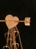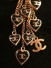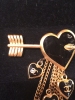 Features black enamel heart with a goldtone arrow through it stamped CHANEL. Staggered, dangling gold chain links with black and gold logo hearts and one dangling gold CC charm.