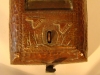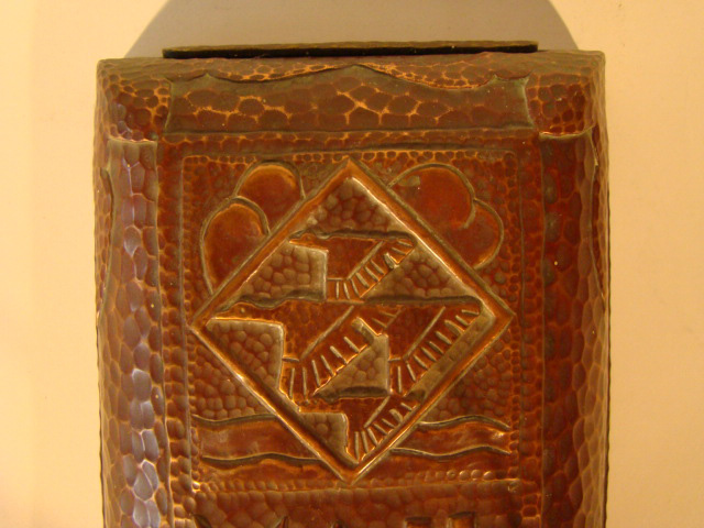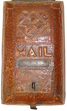 Hand Hammered Copper Deco mailbox with flying bird motif. Has top levered opening for standard size mail as well as option for full tilt opening accessing from the bottom. MAIL is hammered on the surface and underneath room for a name or address to be added. Has a clip on the bottom for small newspaper or magazine. Inside has an additional pocket to hold/catch mail securely. Loop on the front can accommodate a small lock, if required. Heavy gauge, wall mounted mailbox - very charming!