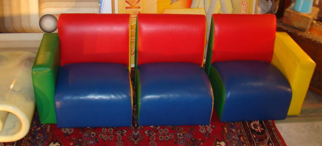 This is a vintage leather 3 piece sofa is created in Google colors! A lot of Fun!. The pieces are 30 inches deep and 31.5 inches high. The pieces with the arms are 27 inches wide with the center section being 27 inches wide.