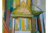 1960s bold and colorful linear abstract oil painting by John Black. Has been painted over an earlier work. Signed lower right. Displayed in a wood frame that has been painted white. 30.5" W x 46.5" H
