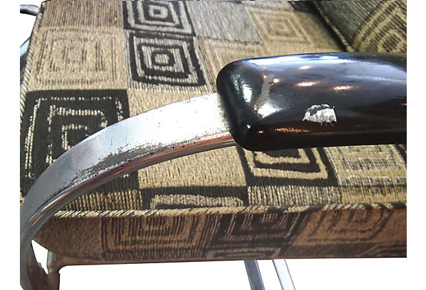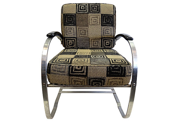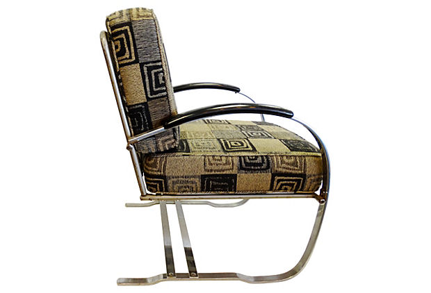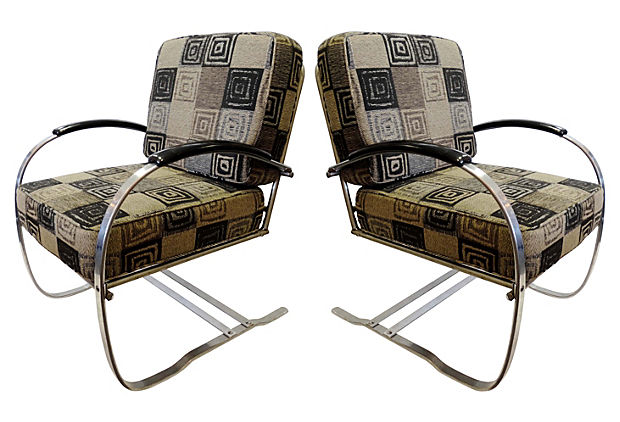 Pair of Wolfgang Hoffmann Art Deco chrome springer lounge chairs for Howell. The frames are in original unrestored condition. The fitted, zippered cushions have been reupholstered. Seat, 18.75"H; arm, 25"H. 28" L x 24.5" W x 35.5" H
