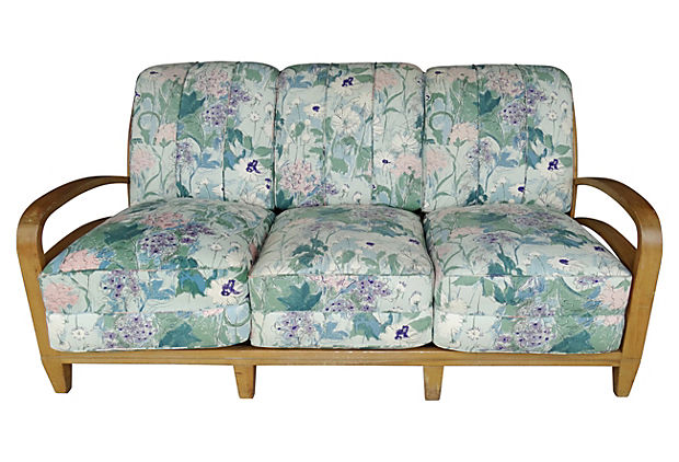 Large 1950's sofa with bentwood arms and frame in the style of Heywood Wakefield. Vintage upholstery in a floral design. 3 separate bottom cushions double height. 3 separate back cushions. Seat H:19", Arm H: 22". 68" L x 35" W x 33" H