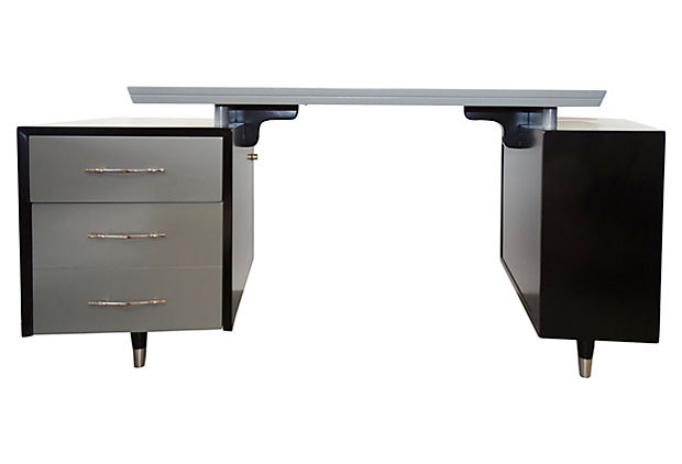 Late 1950's to early 1960's two-tone gray and black newly lacquered oak and hardwood midcentury desk. Elevated top is gently curved with two drawers below to the left and two shelves open to the other end. Four tapered legs support the side with drawers, with two legs below the side with shelves. The drawers have a lock. 60.25" L x 24" W x 29" H