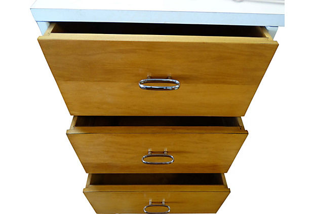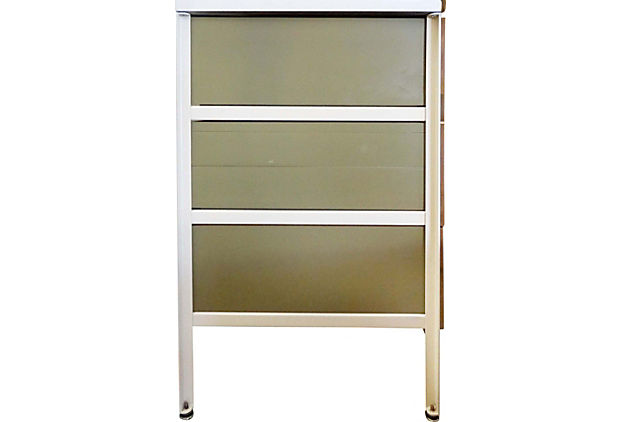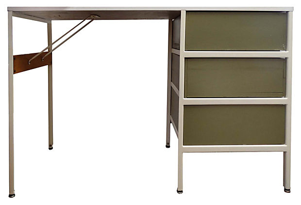 George Nelson California Modern Steelframe line desk made for Herman Miller. 3 drawers with chrome pulls. Drawers have wood fronts with painted sides. 42" L x 18" W x 30" H
