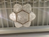 Gorgeous French Art Deco chandelier with six outer clear frosted molded glass panels and beautiful center bowl having floral motif. Polished details on a nickel bronze frame with a floral design continuing to the ceiling plate.